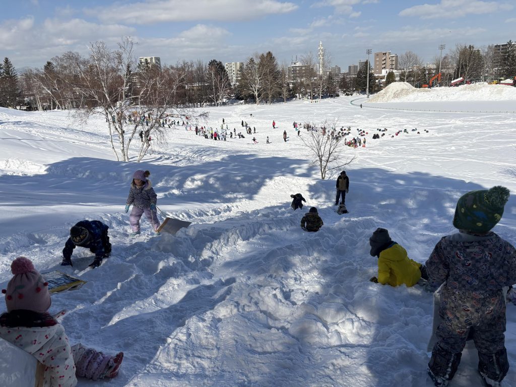 10日(火)に、年少たんぽぽ組は、月寒公園に行って、そり滑りをして遊んできましたよ。そり滑りの後に広い場所で思いっきりはしいて鬼ごっこをして楽しみました。