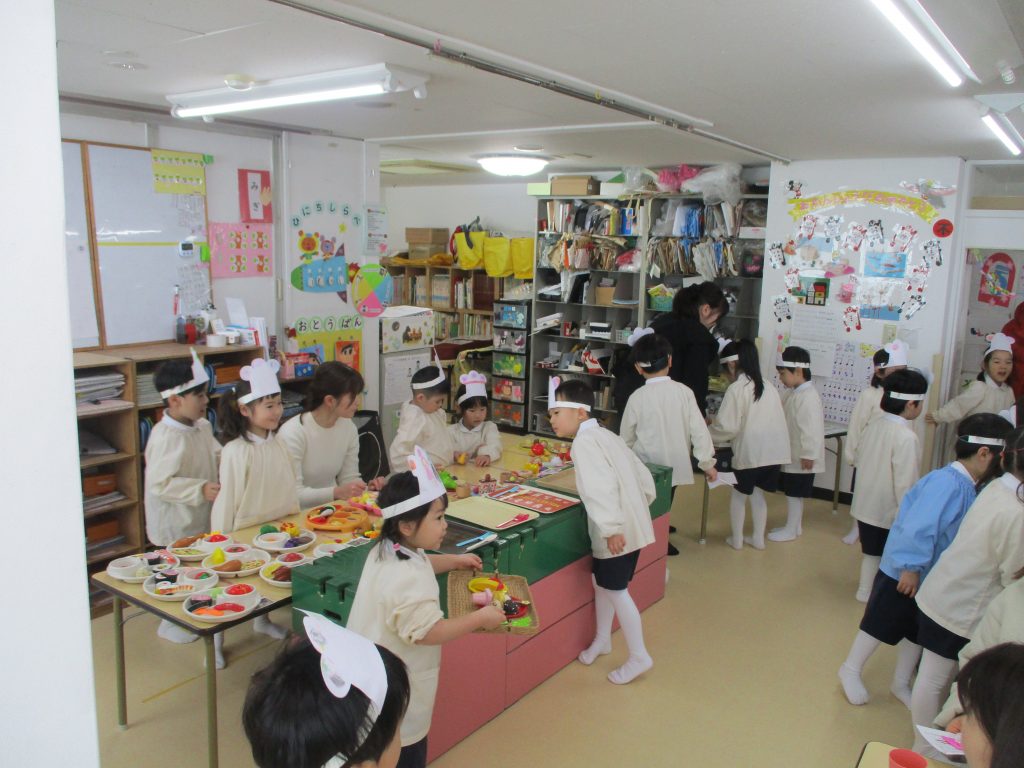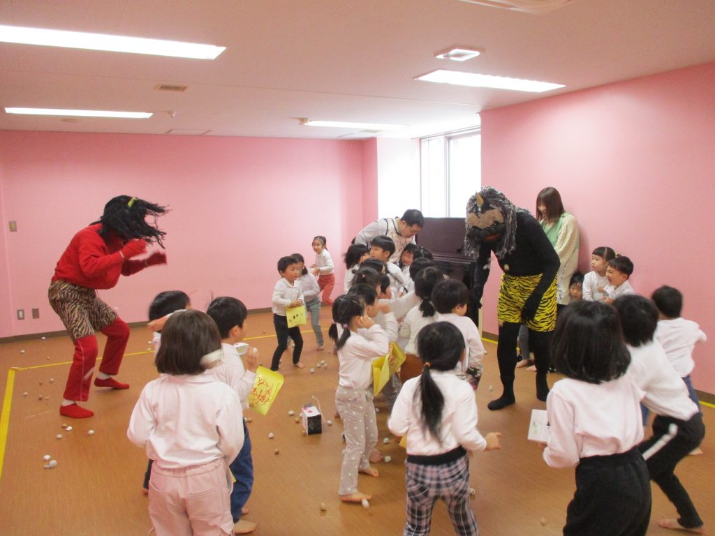 3日(火)は節分の日で、幼児クラスの子どもたちは、豆入れを持ち3階の運動場に行って、節分のクイズに答えた後に鬼の攻略方法について話し合い、太鼓の音と共に鬼が登場すると、覚悟はしていましたが勇気を振り縛り豆まきをしましたよ。鬼が退散すると福の神が登場し、明日から立春になり少しずつ春が近くなってくることを知らせました。